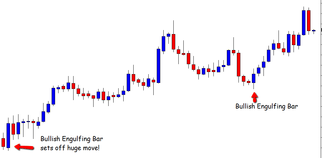 An example of a Bullish Engulfing Bar is attached below. Notice how large and obvious this candle was. Many would be afraid because of how large the candle was, but look at the move the engulfing bar set off!